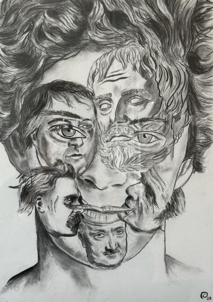 Quell, Aristoteles, Hegel, Nietzsche, Heidegger, Deleuze, 29,7x42cm, Kohle auf Papier – ein Geburtstagsgeschenk an meinen besten Freund.